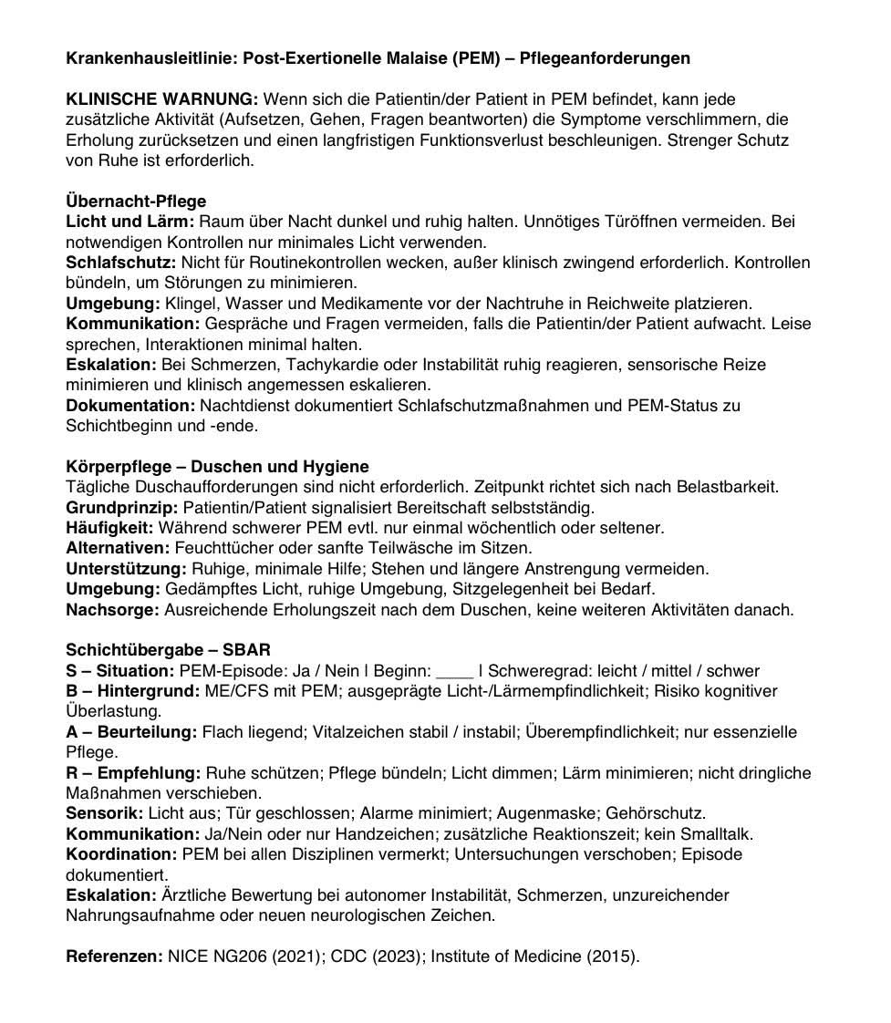 Kommentar schreiben (0 Kommentare)Krankenhausleitlinie: Post-Exertionelle Malaise (PEM) - Pflegeanforderungen
