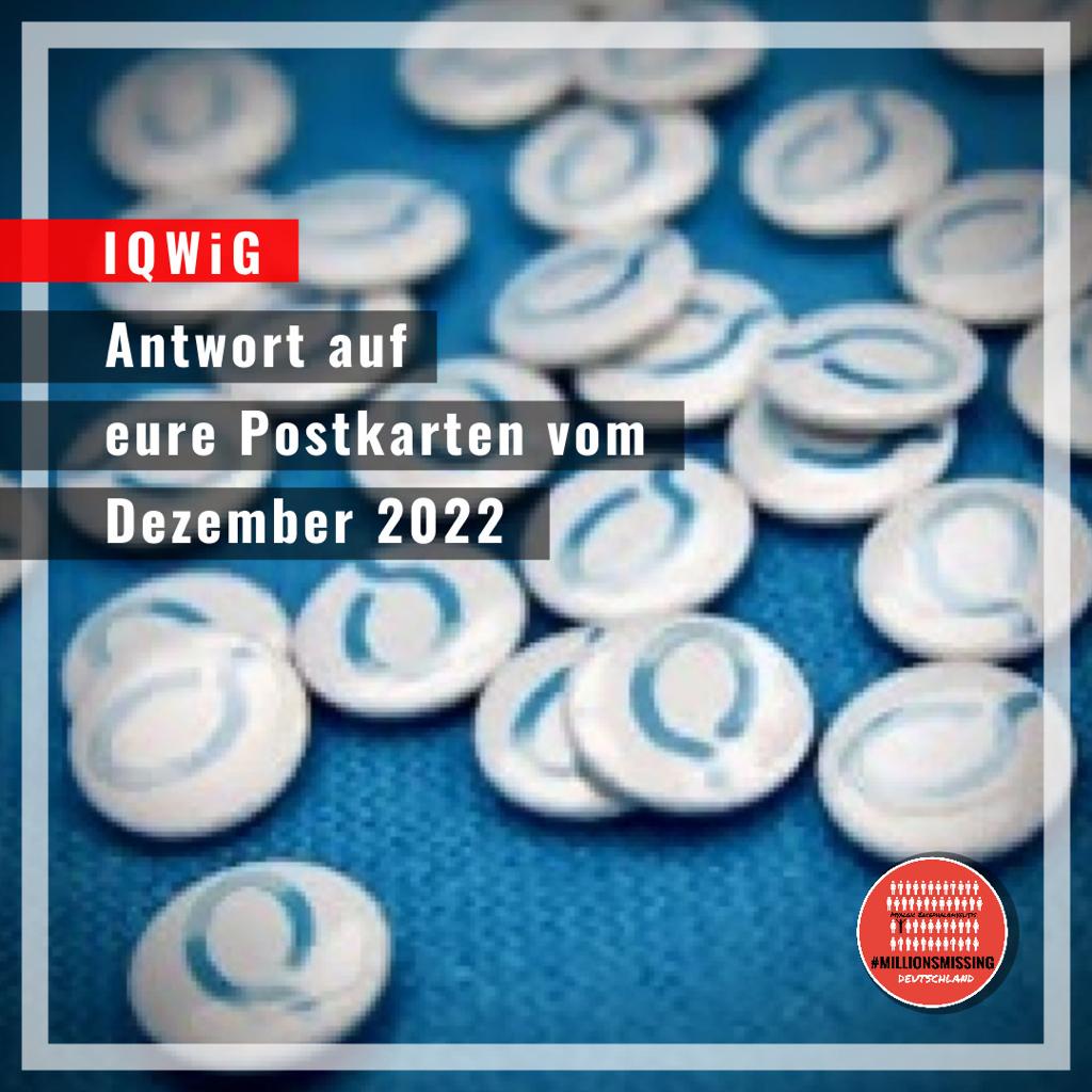 Im Dezember 2022 rief #MillionsMissing Deutschland dazu auf, Postkarten an das Institut für Qualität und Wirtschaftlichkeit im Gesundheitswesen (IQWiG) und an das Bundesministerium für Gesundheit (BMG) zu senden. Grund für diese Aktion war der besorgniserregende Vorbericht des IQWiG. Dieser gab Anlass zur Sorge, dass Betroffene zukünftig auf Grundlage des Berichts schädlichen Therapiekonzepten ausgesetzt sind, trotz fehlender Evidenz.