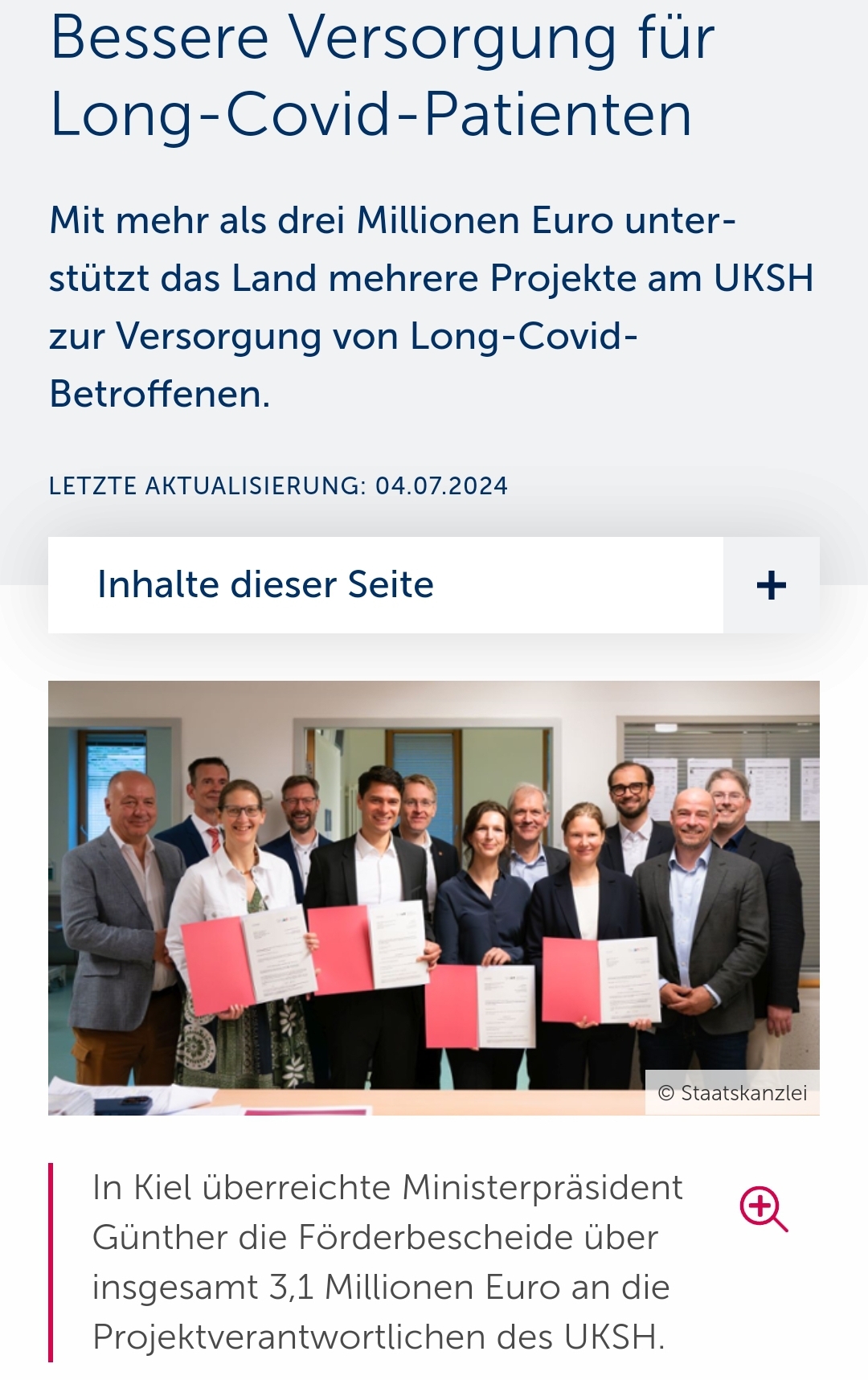 ℹ️ In Kiel hat Ministerpräsident Daniel Günther nun Förderbescheide in Höhe von insgesamt 3,1 Millionen Euro an die Projektverantwortlichen überreicht. Das Land unterstützt mehrere Projekte am Universitätsklinikum Schleswig-Holstein zur Versorgung von Long-Covid-Betroffenen.
