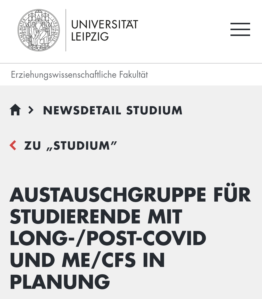 ℹ️ Um den Auswirkungen auf das Studium und Leben einen Raum zu geben und einen unterstützenden Austausch zu ermöglichen, gab es Interesse aus der Studierendenschaft, eine Long-Covid-Austauschgruppe ins Leben zu rufen. Diese Gruppe soll eine Plattform bieten, sich untereinander zu verknüpfen und Erfahrungen auszutauschen.