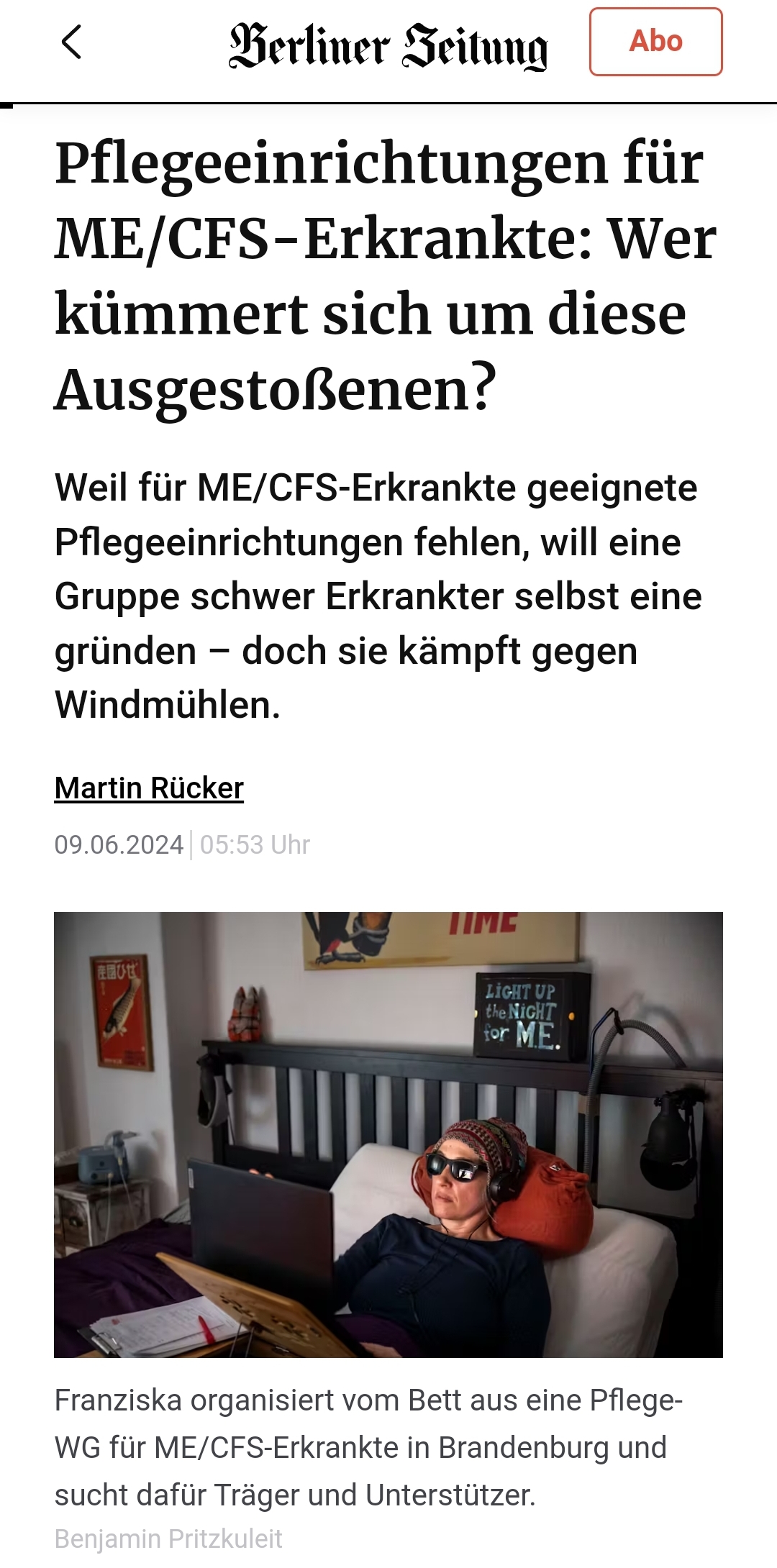 📌 Weil für ME/CFS-Erkrankte geeignete Pflegeeinrichtungen fehlen, will eine Gruppe schwer Erkrankter selbst eine gründen – doch sie kämpft gegen Windmühlen.