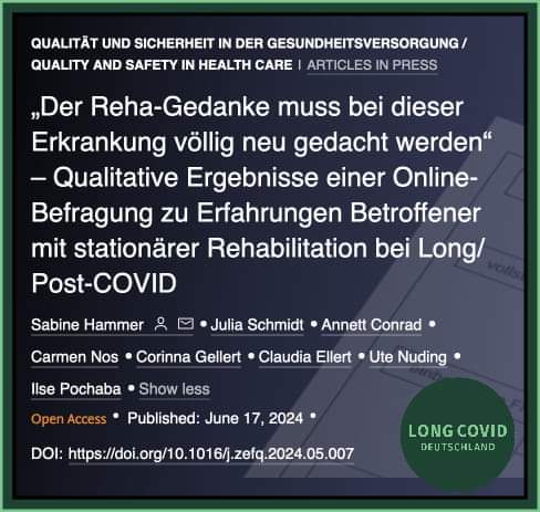 Die Ergebnisse eines Kooperationsprojekts der Betroffeneninitiative Long COVID Deutschland und der Hochschule Fresenius in Idstein sind nun in der Zeitschrift für Evidenz, Fortbildung und Qualität im Gesundheitswesen veröffentlicht. In der Studie wurden über 733 Long COVID- Betroffene zu ihren Erfahrungen mit stationärer Rehabilitation befragt. 50 % der Teilnehmer*innen gaben an, dass sich ihr Gesundheitszustand 4 Wochen nach der Rehabilitation, im Vergleich zu vorher, verschlechtert hat.