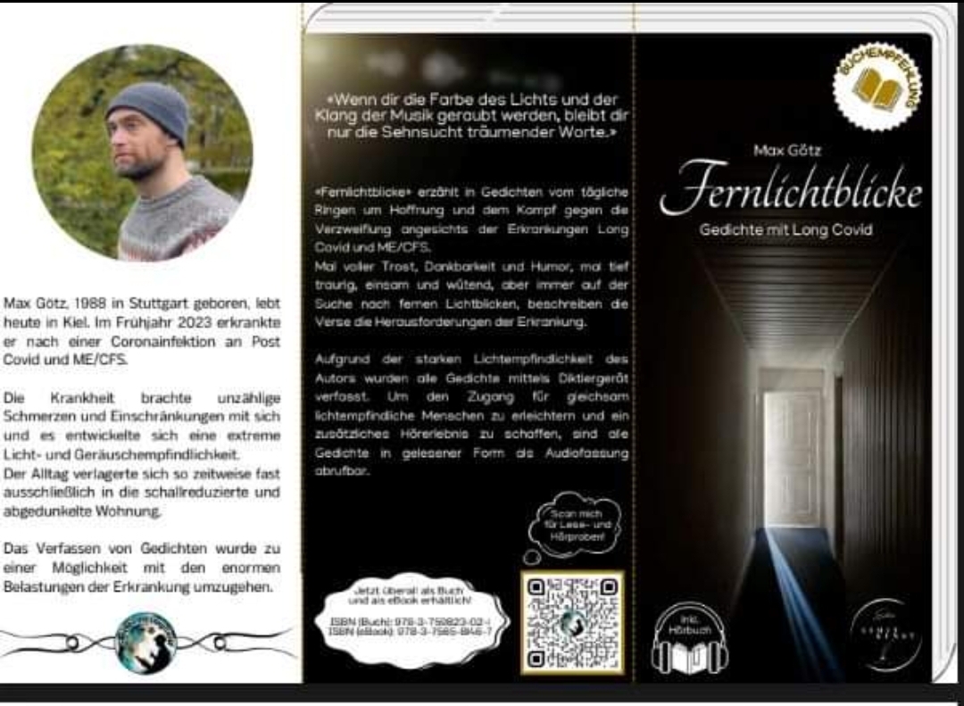 nun ist es endlich soweit, ich (Max Götz) möchte gerne mein Buch "Fernlichtblicke" mit allen Long Covid und ME/CFS betroffenen teilen. Ich hoffe, dass ich damit ein bisschen Sichtbarkeit und vor allem Verbundenheit herstellen kann. Das Buch ist auch als Hörbuch enthalten und der Preis ist so niedrig wie möglich gesetzt, da es mir nicht um Einnahmen geht. Ich sage das immer dazu, weil ich keinen falschen Eindruck erwecken möchte."