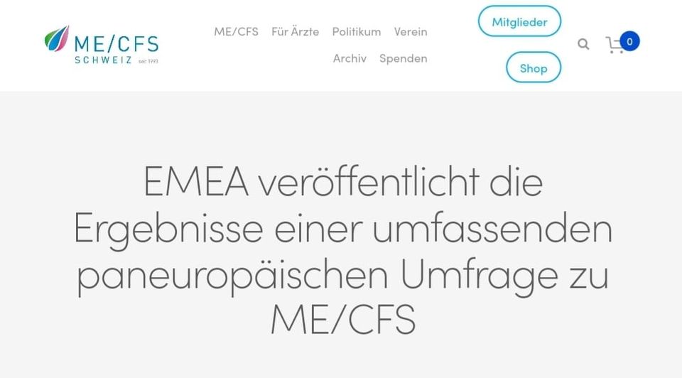 Die EMEA (Europäische ME Allianz) hat 2021 eine gross angelegte paneuropäische Studie zu ME/CFS durchgeführt. Auf der Basis von über 11'000 Patientenbefragungen zu Krankheitsmerkmalen, Krankheitsverlauf, Zugang zu Gesundheitsversorgung etc. macht sie auf äusserst gravierende Mängel bei der Anerkennung der Myalgischen Enzephalomyelitis sowie der medizinischen Versorgung der Betroffenen und der sozialen Unterstützung aufmerksam. Sie fordert Regierungen, Gesundheitsdienstleister und weitere Akteure auf, mit EMEA zusammenzuarbeiten und Massnahmen zu ergreifen, um die Problematik rund um ME/CFS anzugehen.