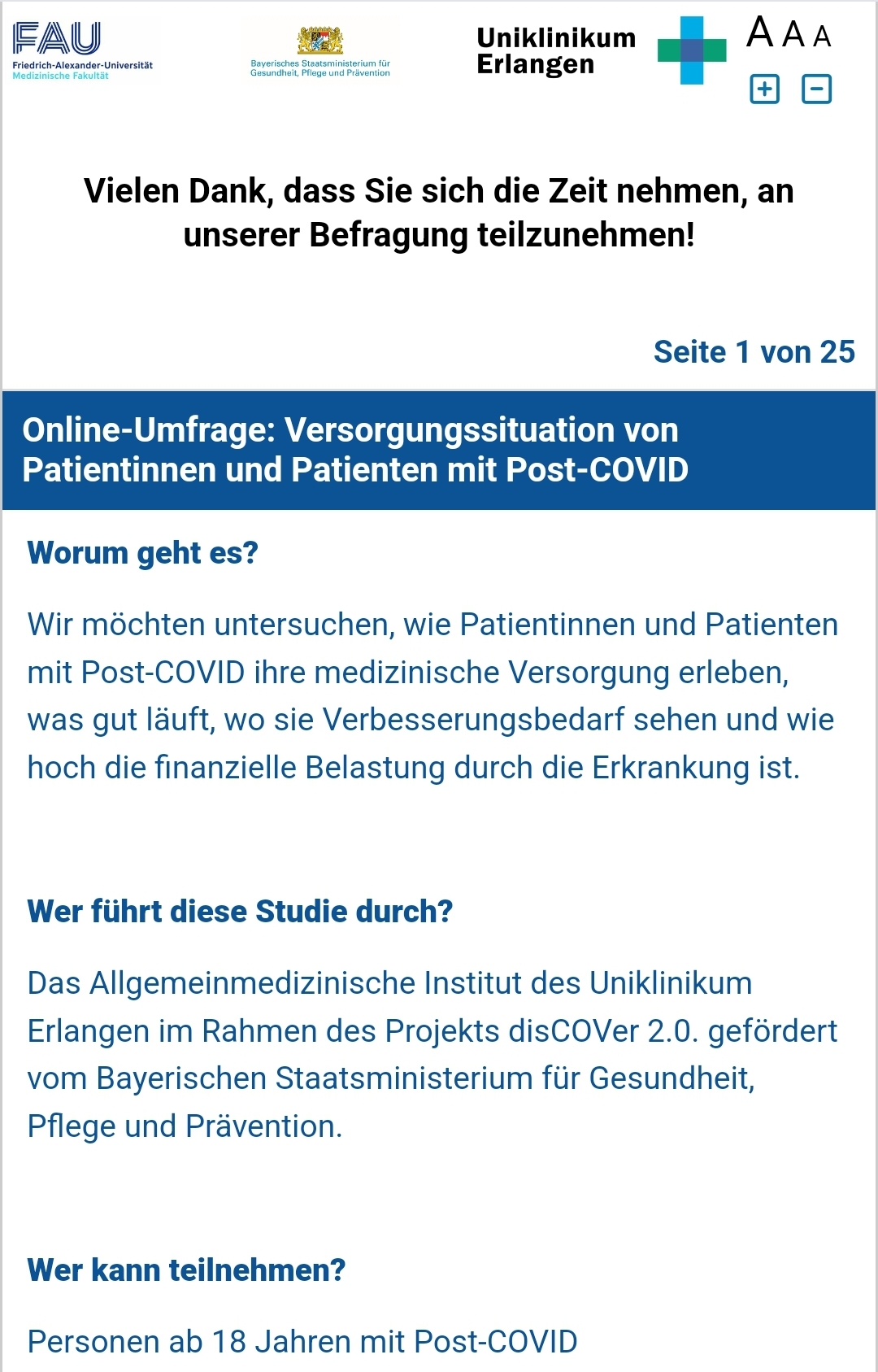 ℹ️ Wie gut sich Post-Covid-Betroffene versorgt fühlen, will eine Online-Umfrage aus Erlangen herausfinden. Teilnehmen können Patienten bundesweit.