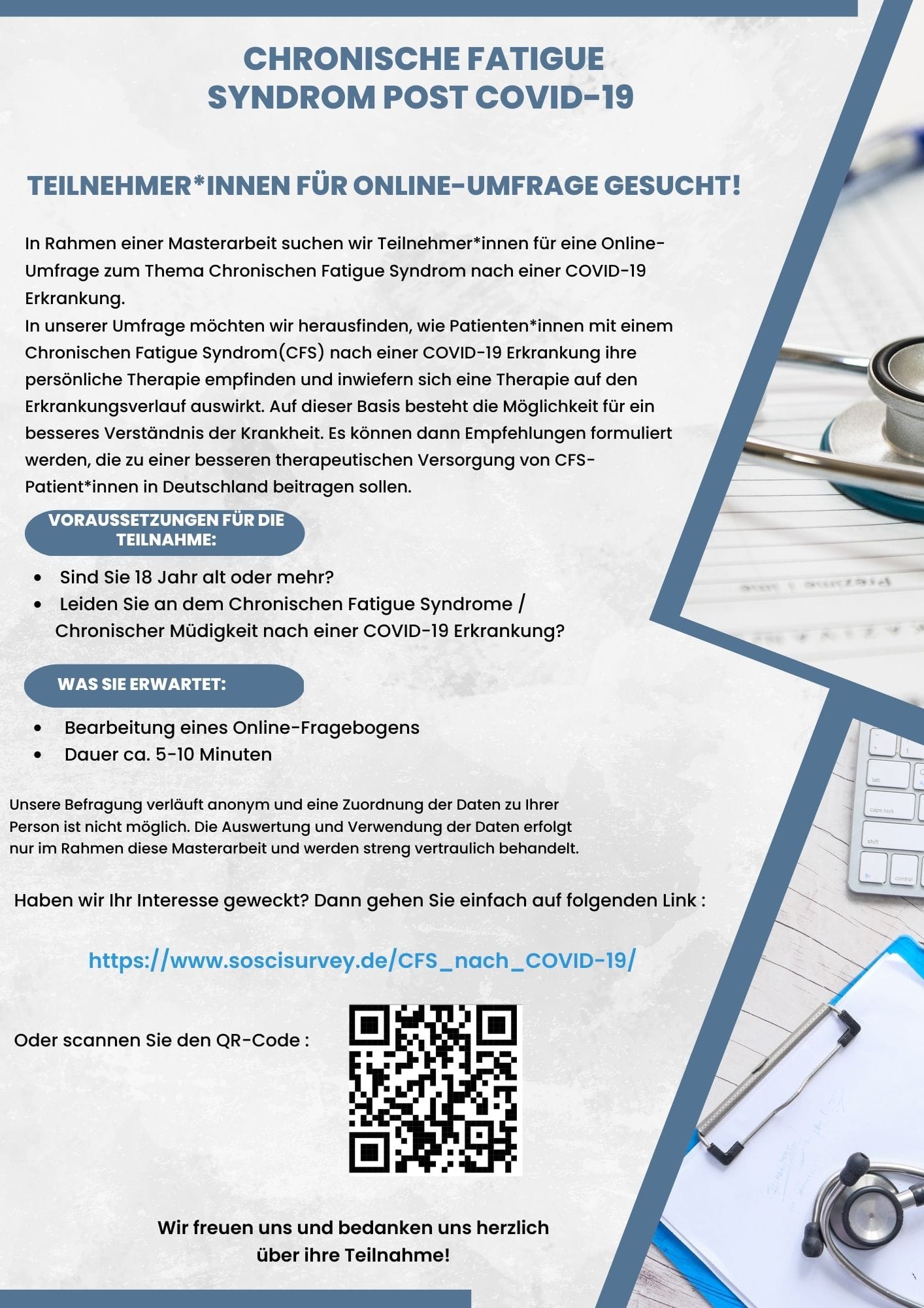 Eine Masterstudentin sucht in unserer Community Teilnehmer*innen für die Teilnahme an einer kurzen Online-Umfrage. Es geht spezifisch um Betroffene, die CFS nach einer Covid-19 Infektion entwickelt haben. Weiter Infos auf dem Flyer.