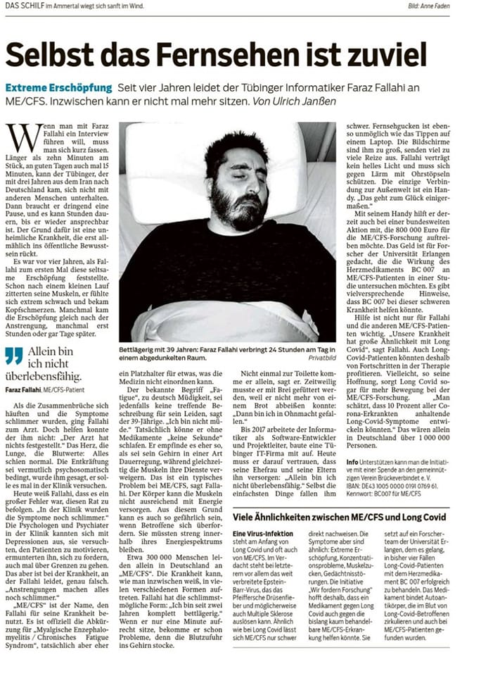 "Seit vier Jahren leidet der Tübinger Informatiker Faraz Fallahi an ME/CFS. Inzwischen kann er nicht mal mehr sitzen."