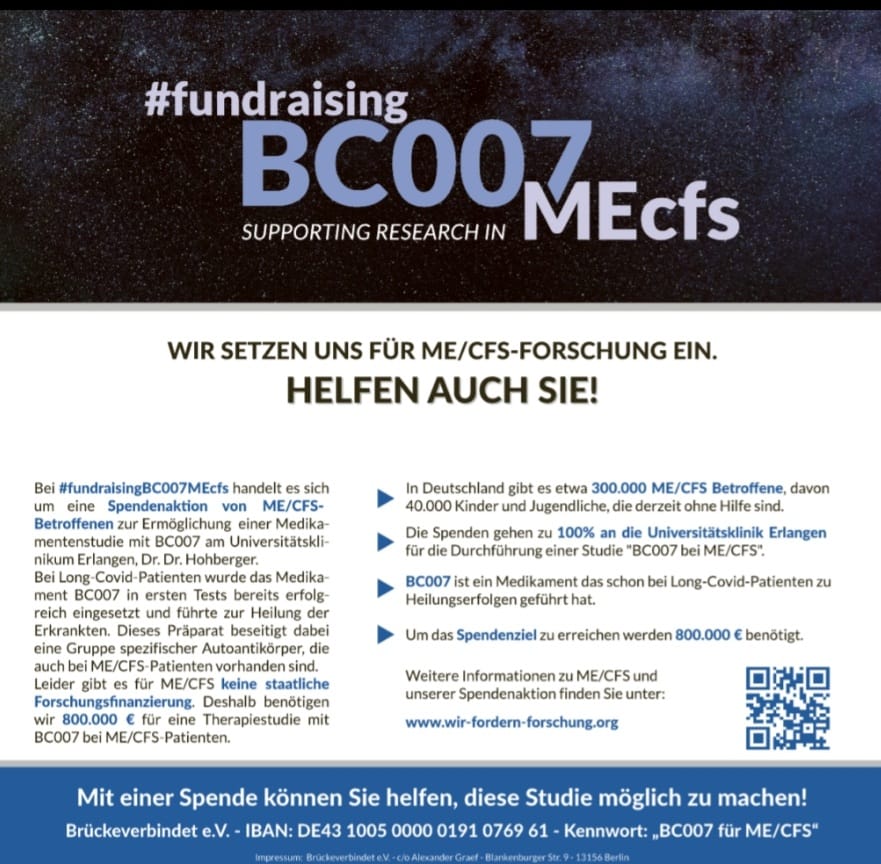 Bei #fundraisingBC007MEcfs handelt es sich um eine Spendenaktion von ME/CFS-Betroffenen zur Ermöglichung einer Medikamentenstudie mit BC007 am Universitätsklinikum Erlangen.