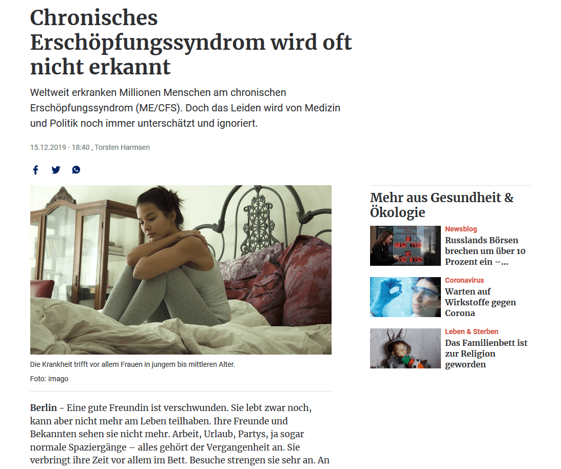 Weltweit erkranken Millionen Menschen am chronischen Erschöpfungssyndrom (ME/CFS). Doch das Leiden wird von Medizin und Politik noch immer unterschätzt und ignoriert. Berlin Eine gute Freundin ist verschwunden. Sie lebt zwar noch, kann aber nicht mehr am Leben teilhaben. Ihre Freunde und Bekannten sehen sie nicht mehr. Arbeit, Urlaub, Partys, ja sogar normale Spaziergänge – alles gehört der Vergangenheit an. Sie verbringt ihre Zeit vor allem im Bett. Besuche strengen sie sehr an. An guten Tagen kann sie ein paar Seiten in einem Buch lesen, für ein paar Minuten aufstehen und sitzen. Sie kann sich kein Essen machen, denn sie schafft es nicht, die Arme zu heben. Das kostet zu viel Energie.