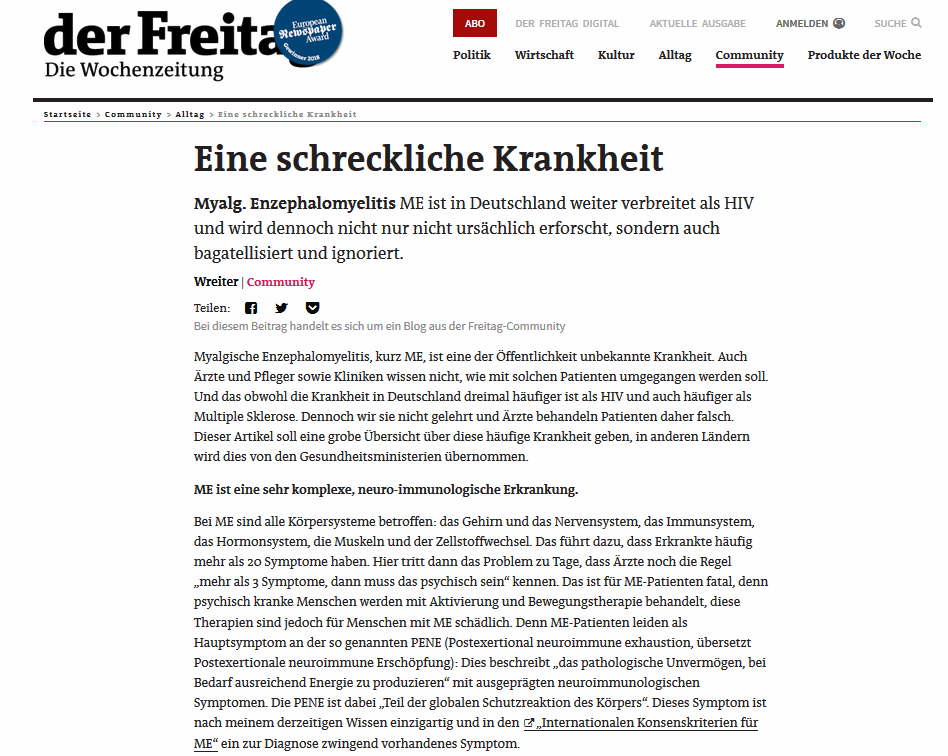 Ein informativer und gut recherchierter Artikel zu ME/CFS. Insbesondere der letzte Satz spricht uns Erkrankten absolut aus dem Herzen: "Die Forschung kann in den nächsten Jahren wahrscheinlich viele Fragen beantworten. Doch dazu müssen endlich in großem Stil Mittel fließen."
