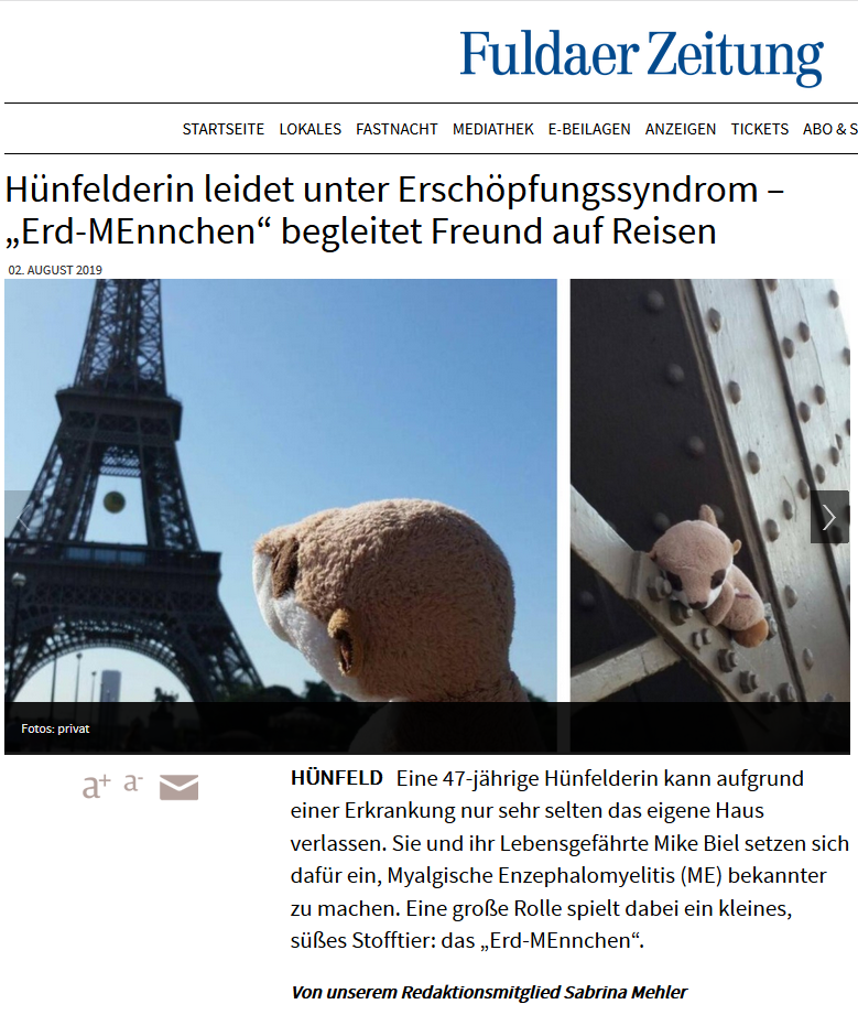 Eine 47-jährige Hünfelderin kann aufgrund einer Erkrankung nur sehr selten das eigene Haus verlassen. Sie und ihr Lebensgefährte Mike Biel setzen sich dafür ein, Myalgische Enzephalomyelitis (ME) bekannter zu machen. Eine große Rolle spielt dabei ein kleines, süßes Stofftier: das „Erd-MEnnchen“.