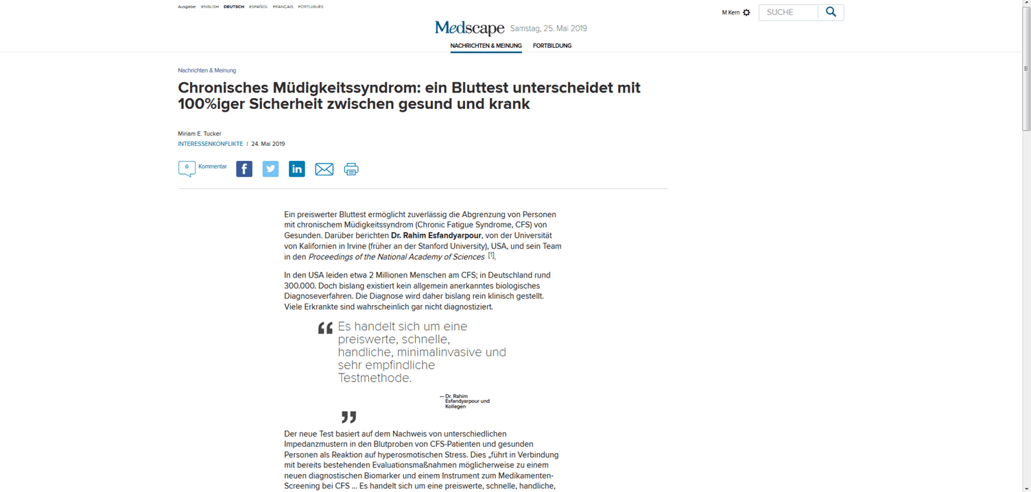 In den USA leiden etwa 2 Millionen Menschen am CFS; in Deutschland rund 300.000. Doch bislang existiert kein allgemein anerkanntes biologisches Diagnoseverfahren. Die Diagnose wird daher bislang rein klinisch gestellt. Viele Erkrankte sind wahrscheinlich gar nicht diagnostiziert. Es handelt sich um eine preiswerte, schnelle, handliche, minimalinvasive und sehr empfindliche Testmethode. Dr. Rahim Esfandyarpour und Kollegen.