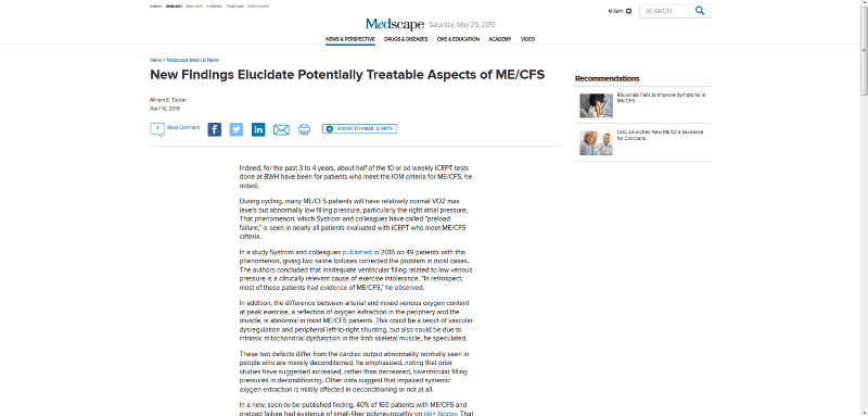 Bethesda, MD - Neue Beweise für kardiopulmonale und Nervensystemabnormalitäten bei Patienten mit myalgischer Enzephalomyelitis / chronischem Fatigue-Syndrom (ME / CFS) liefern Hinweise auf die Ätiologie ihrer Bewegungsintoleranz und weisen auf mögliche Behandlungen hin.